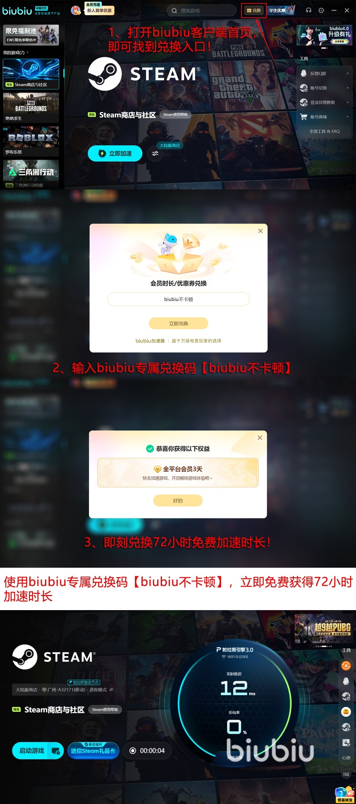那么心动不如行动吧!新人现在注册可以拿到24小时的免费使用,biubiu的全功能都能用,不限节点,不限游戏。而广大新老用户,输此【biubiu不卡顿】口令码,可即加赠72小时免费时间。