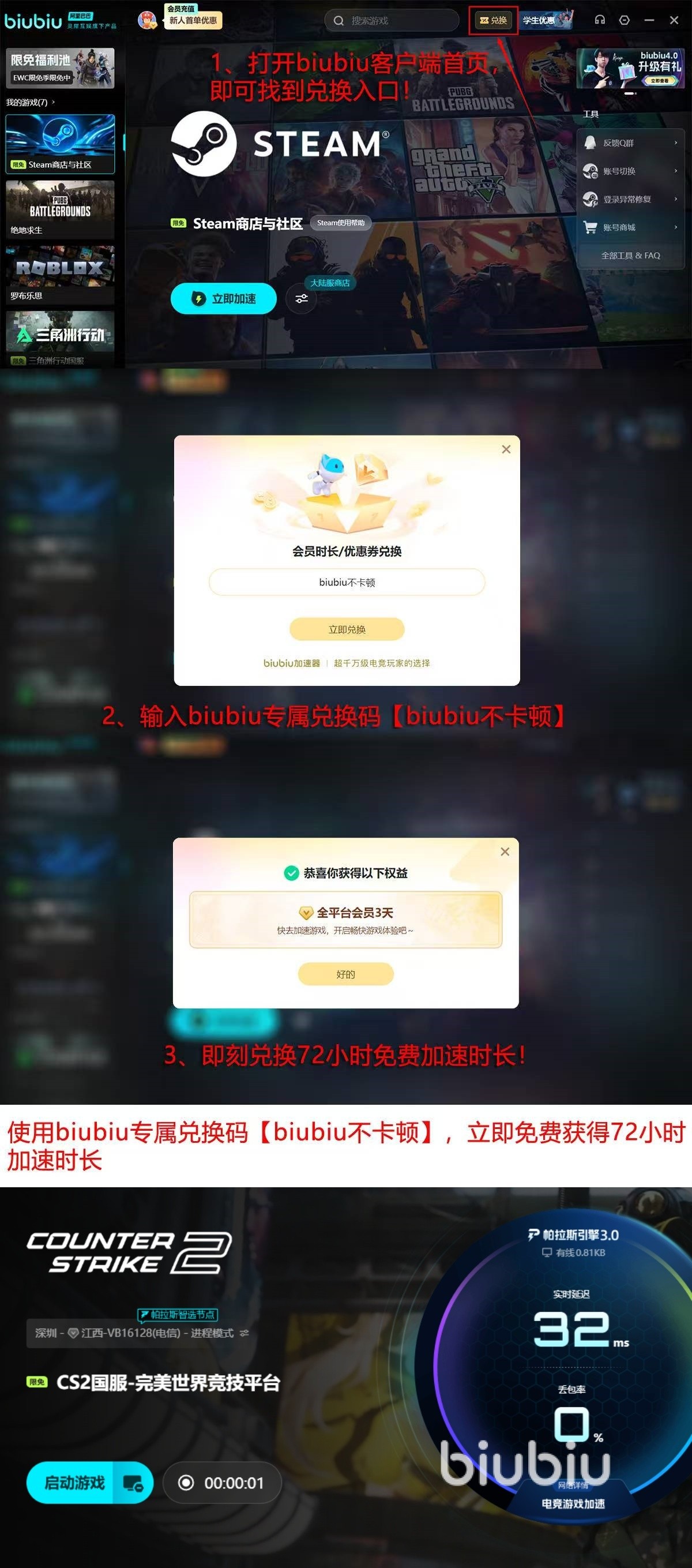这些也是经过PUBG全球冠军左梓轩验证的,他参与到调优与压力测试中,验证了产品性能可靠。平台也降低新用户使用门槛,注册账号就有24小时免费试用时长,“biubiu不卡顿”口令额外有72小时无限制加速时间,超长免费体验。