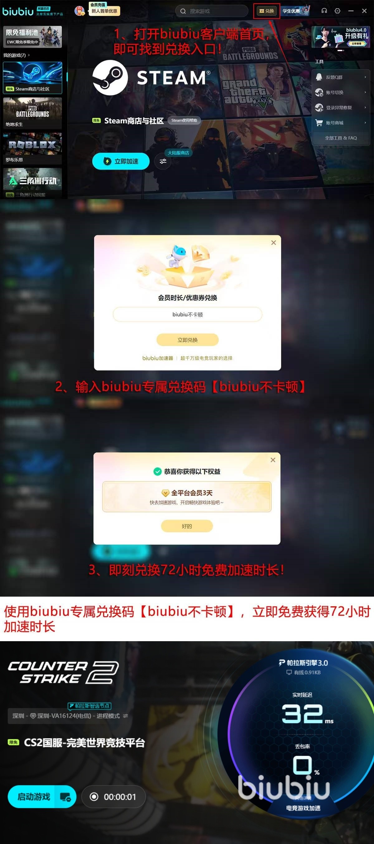 对于新用户,平台也提供了阶段免费体验福利,注册账号后,立即获得24小时全功能免费试用,输入兑换码“biubiu不卡顿”,额外再领取72小时免费加速效果,叠加就能享受96小时不受限加速。