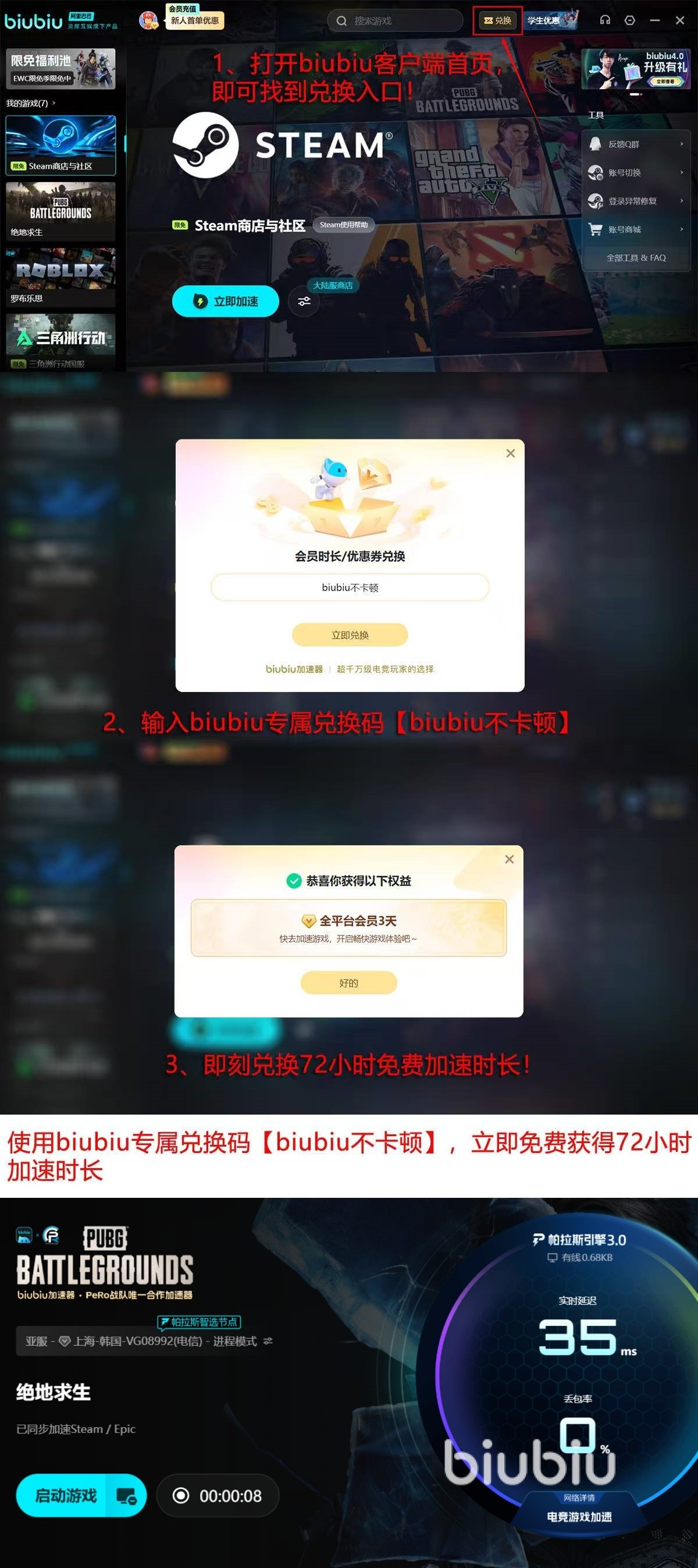 新注册用户能立刻获取24小时全功能免费试用权限;如果想要延长体验时间,“biubiu不卡顿”兑换码额外就能激活72小时权限,累积96小时无限制加速服务,多款大型游戏都支持加速。