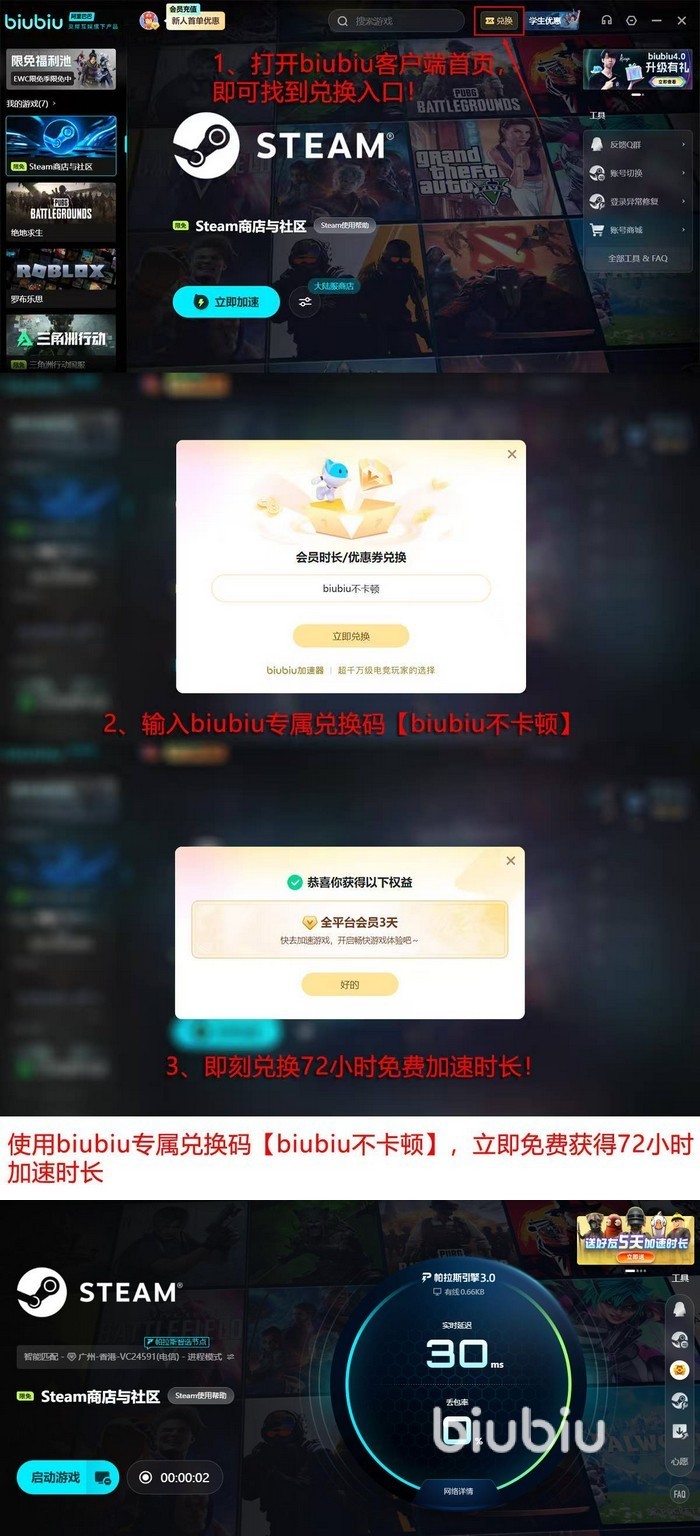 Biubiu技术与福利两手硬,为了能让大家对它更加放心,买得更加安心,也是提供了超长的体验时长,新用户注册登录后直接给到24H的免费时长,这个时间用完了觉得意犹未尽,继续使用“biubiu不卡顿”口令码还能再换3天全平台的会员,这两合计对于新人来说就是96H的体验时长了。