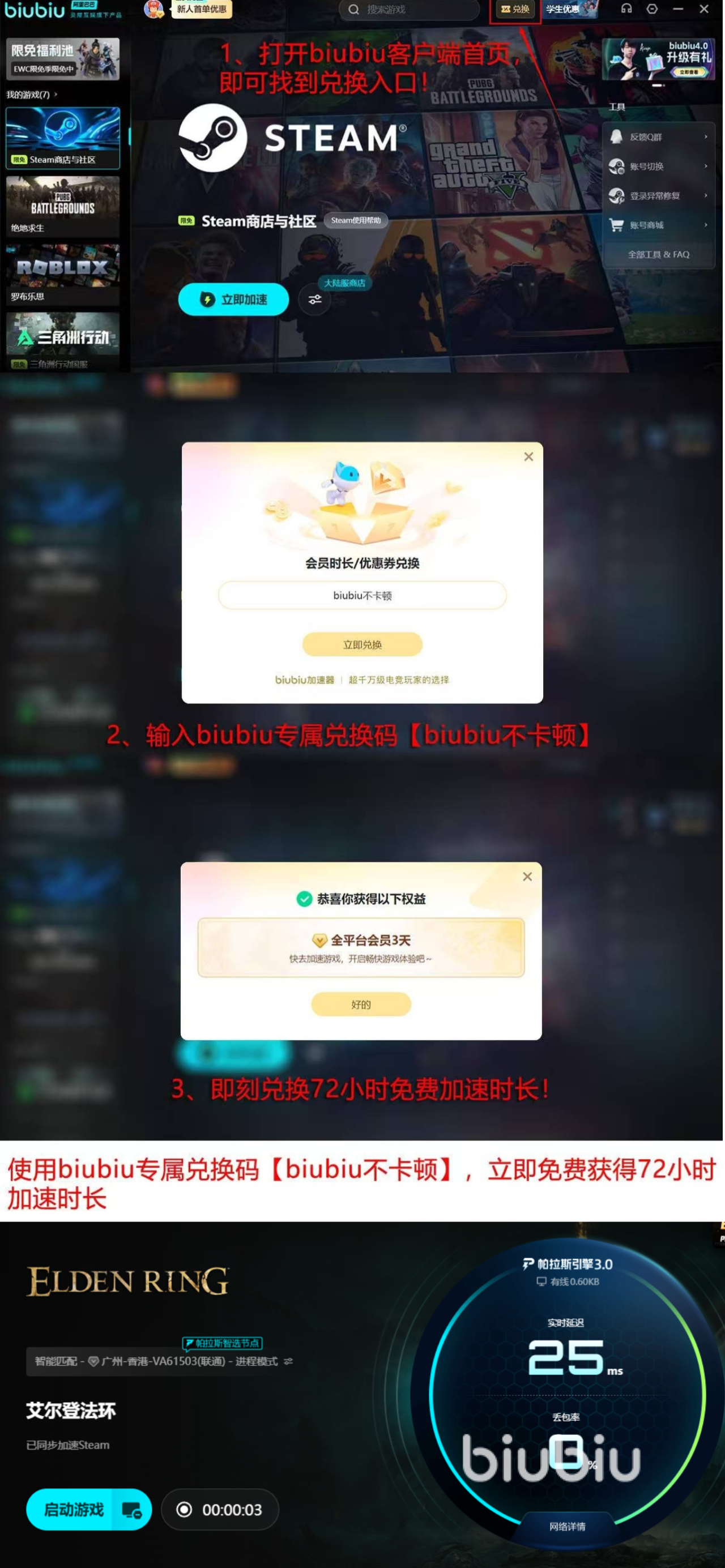 重磅福利来袭!现在注册即送24小时免费加速!无论新老用户,只需输入口令 【biubiu不卡顿】,就能额外再加赠3天免费时长!新人福利叠加兑换奖励立即激活玩家的畅玩体验。