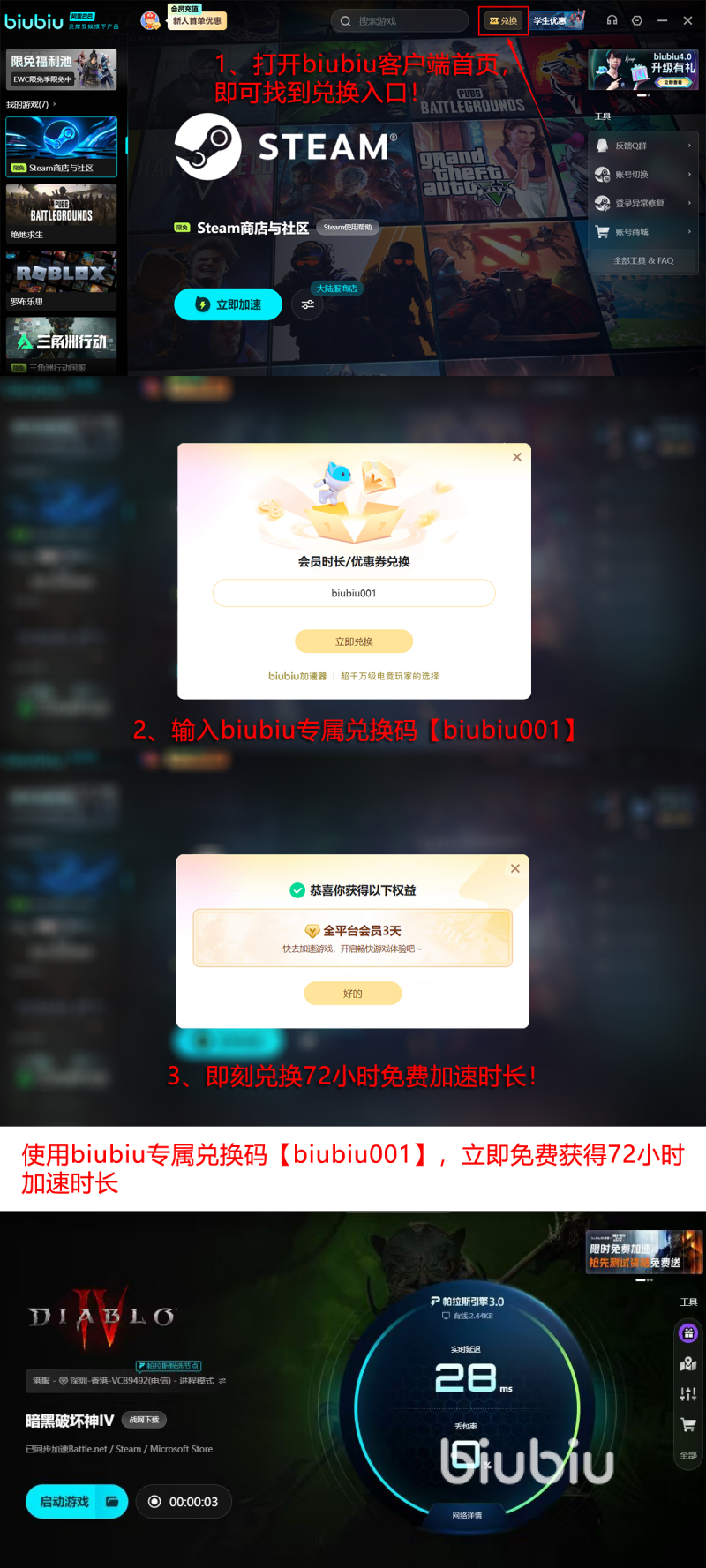 此应用在不断更新,无论是具体的技术还是福利方面都是非常别致的,为了降低用户的体验成本,针对所有新用户,全面开放24小时免费试用功能,所有新老玩家使用【biubiu001】口令即可获得72小时免费加速福利,所有新用户能够累积享受96小时免费服务。