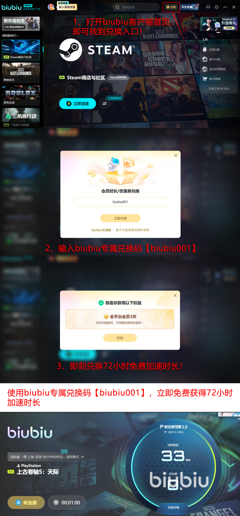 如今的福利对于每一个玩家来说都是比较友好的,因为这一款备受好评的加速工具,新用户注册登录就能够获得24小时免费加速时长,而新老用户则可以通过输入【biubiu001】的这一种方式得到免费三天加速时长。可以说无论是新用户或者是老用户,都给大家全面考虑到了,新用户最多可以利用这两种方法,领取到96小时的免费加速时长。