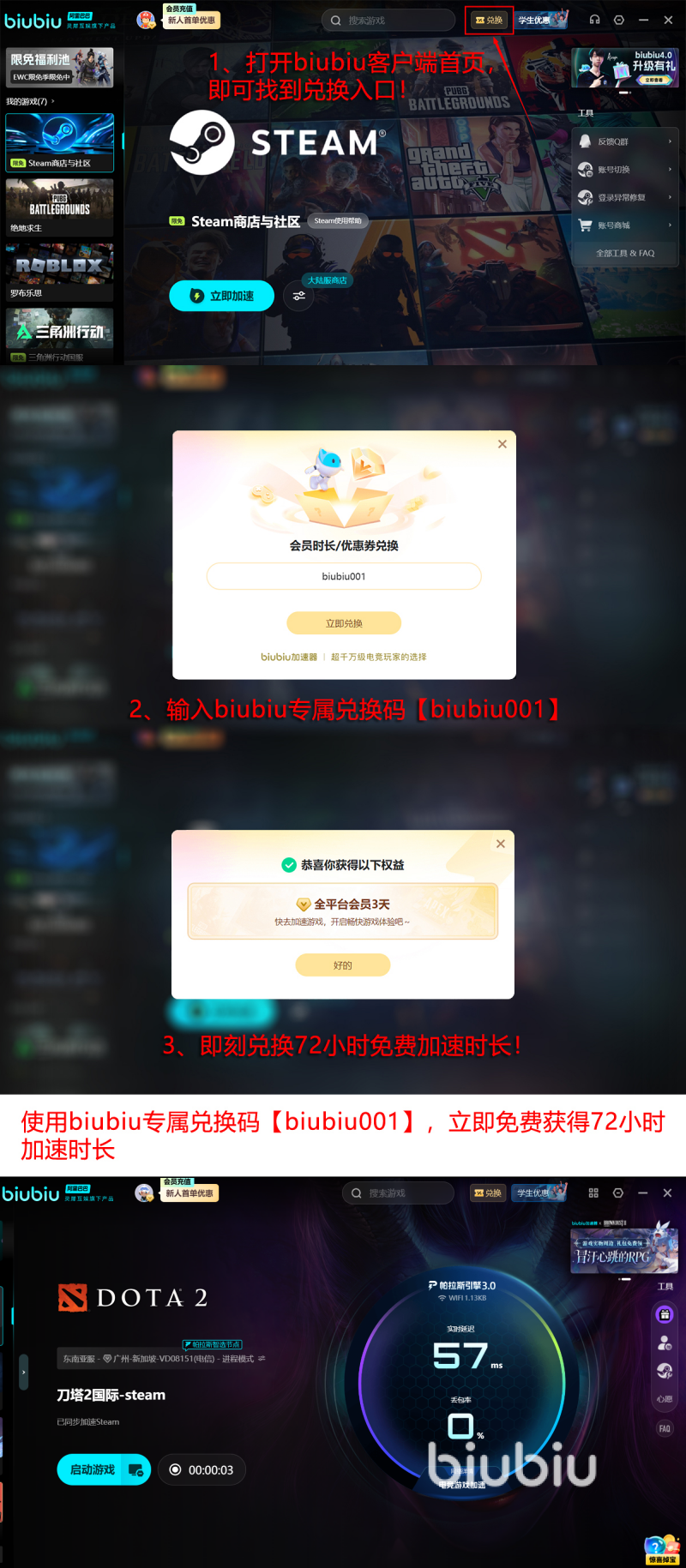 目前所有玩家都能够获得免费试用机会,福利是非常贴心的,如果你是新用户,之前从未注册过,那么可以直接获得24小时免费加速时长,并不需要任何复杂的操作就能够直接领取,这是专为新用户所打造的福利,新老玩家还可以使用口令【biubiu001】领取72小时免费加速福利,两种福利新用户领取之后能够叠加至96小时。
