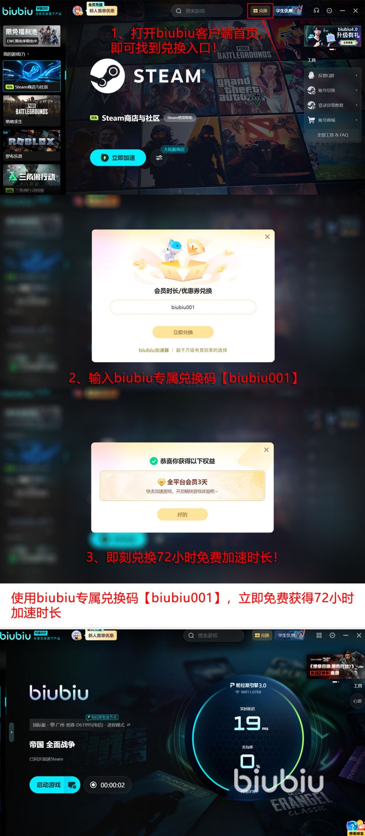 更引人注目的,那当然就是福利方面了,因为大家在首次体验时都不需要立即充钱,避免大家出现踩雷情况,已经给大家推送出两种不同的免费福利都可以任意领取,首次用账号激活之后,就会拥有24小时的加速特权。另外,使用完之后也可使用【biubiu001】成功兑换三天的免费加速时长,那么共计就可达到96小时,在这么长时间中任意可以挑选自己喜欢的游戏一键加速。
