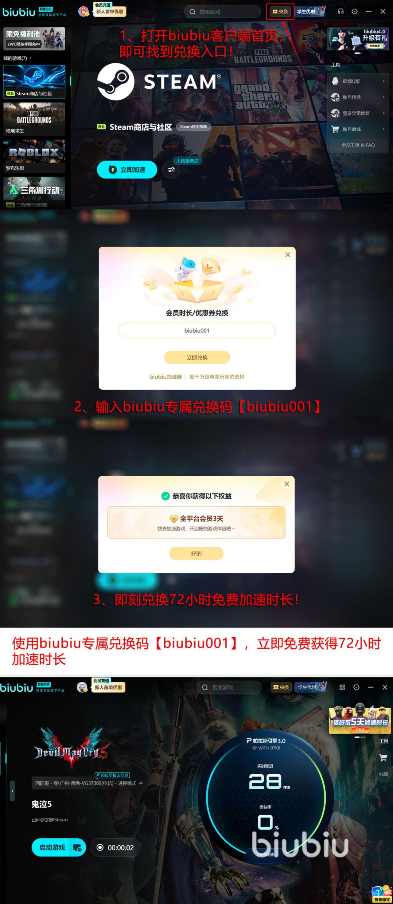 看到这里大家也不需要担心,在体验时就立即需要开通会员,因为目前官方已经推送出两种免费体验的福利,也就是为了能够让大家率先去体验,不会出现踩雷,这两种方式累积下来就可拉长至96小时,其中一种就是新用户第1次注册成功之后会获得一天的免费加速特权,而另外一种是使用【biubiu001】兑换72小时的加速时长。
