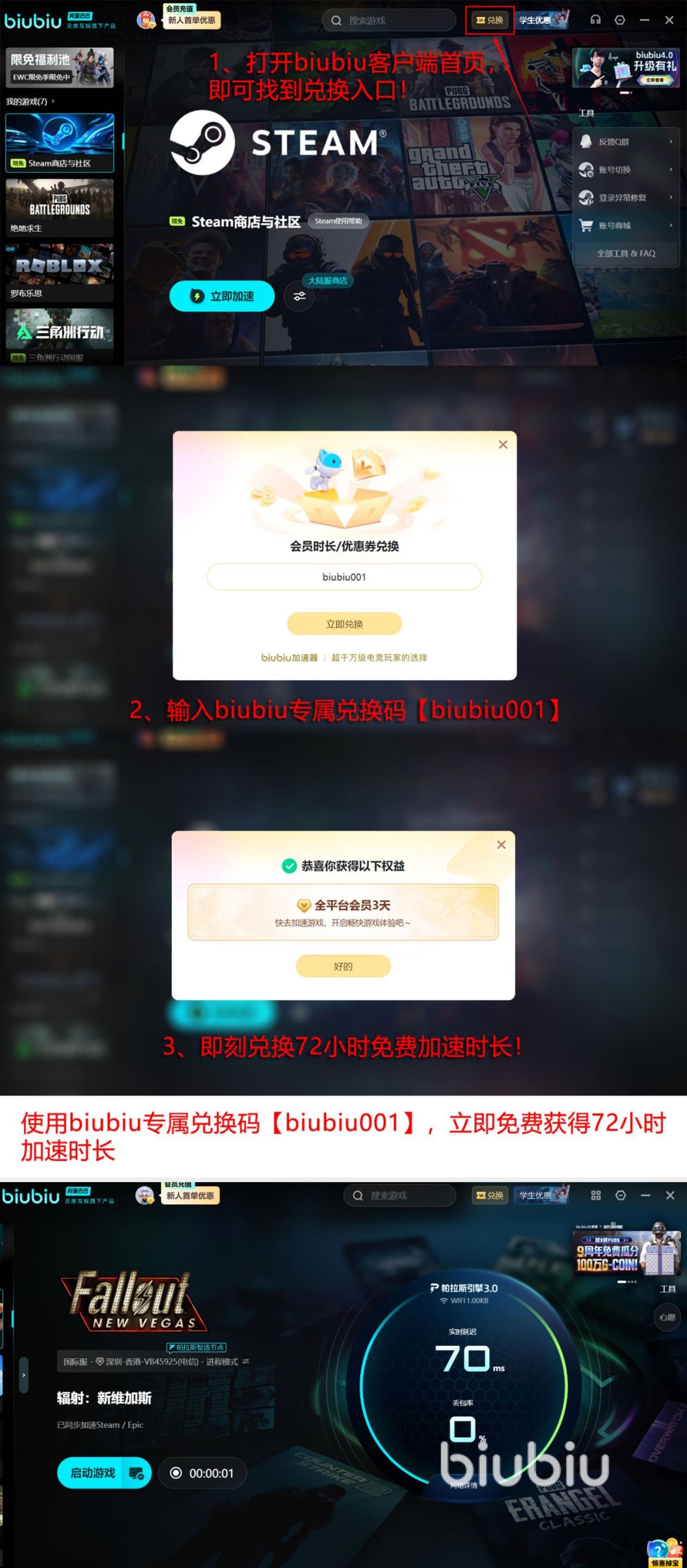 从福利方面来看更是特别贴心,目前已经提供了两种免费体验的福利,首次利用账号成功注册激活的人群就会获得24小时的加速特权,而另外一种就是用【biubiu001】兑换72小时的免费加速特权,所有的福利都会发放在自己的背包中,可随时使用,那么两者都可同时使用,累积到96小时。