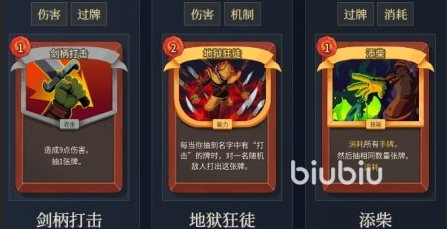 建议大家可以搭载剑柄打击和劫掠的过牌能力,形成无限输出的闭环。地狱狂徒是核心的能力牌,只要抽到带有打击的牌,就可以自动的给敌人打出伤害。剑柄打击和劫掠这两个就是循环的关键,一个可以打出9点伤害,另外一个就可以重新抽取一张牌,建议要抓两张,可以保证过牌的效率。