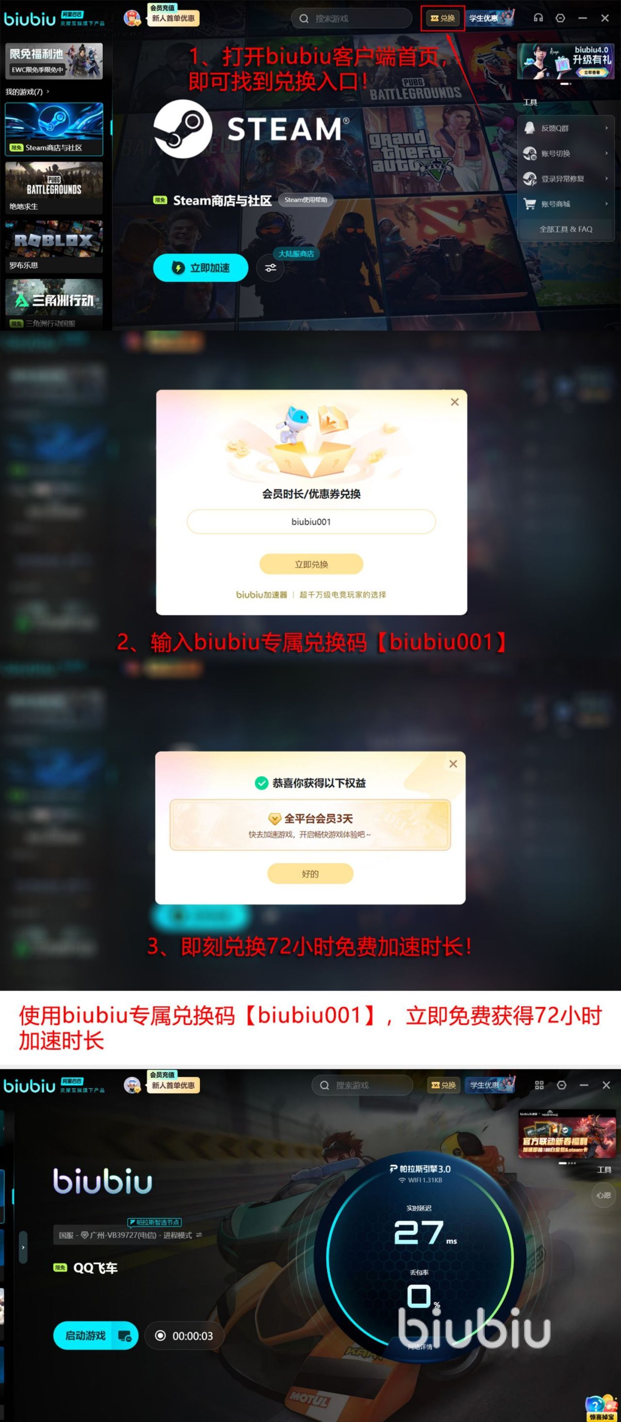 有免费试用活动,尚未使用过的新用户注册之后就能立即获得24小时全平台加速权益,当充分验证其效果,依旧想要继续参与,想要延长使用周期,那么可以使用兑换码【biubiu001】额外继续领取72小时免费加速时长,兑换福利,每个账号都能够使用一次,不分新老用户,累计计算新用户能够叠加至96小时无限制加速服务。
