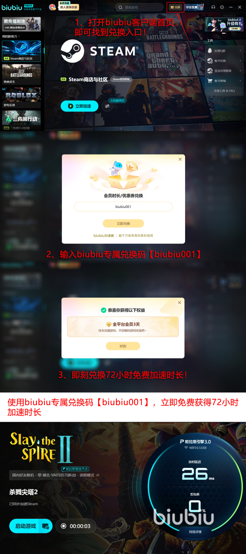 现在还有一个好消息要分享给大家,如果玩家想要使用这款加速器,现在还可以申请免费加速时长。先来看一个通用口令,所有的用户全部都可以申请。使用兑换码【biubiu001】可获得3天免费加速时长,如果是新用户,那么就可以享受24小时免费时长。把这两种方法叠加在一起,新用户最高就可以累计长达96小时,全程都可以享受无卡顿体验游戏,赶紧去领取福利吧。