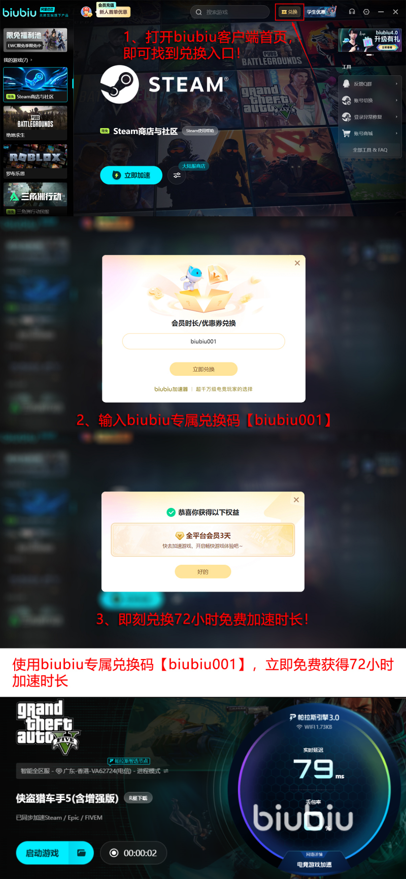 其次之前pubg冠军小叮当也参与了多次的调校工作,还成为此应用的代言人,兼容性也特别广,几乎覆盖了上万款不同的游戏类型,大家可从中任意挑选。目前平民玩家都可免费拥有体验的福利,首次用账号成功激活的人群就会立即拥有一天的加速特权,另外使用完之后还可输入【biubiu001】再次额外领取72小时的加速特权,两种方式都可同时使用,那么对于新体验的平民玩家来说,就比较有福,可供体验96个小时。