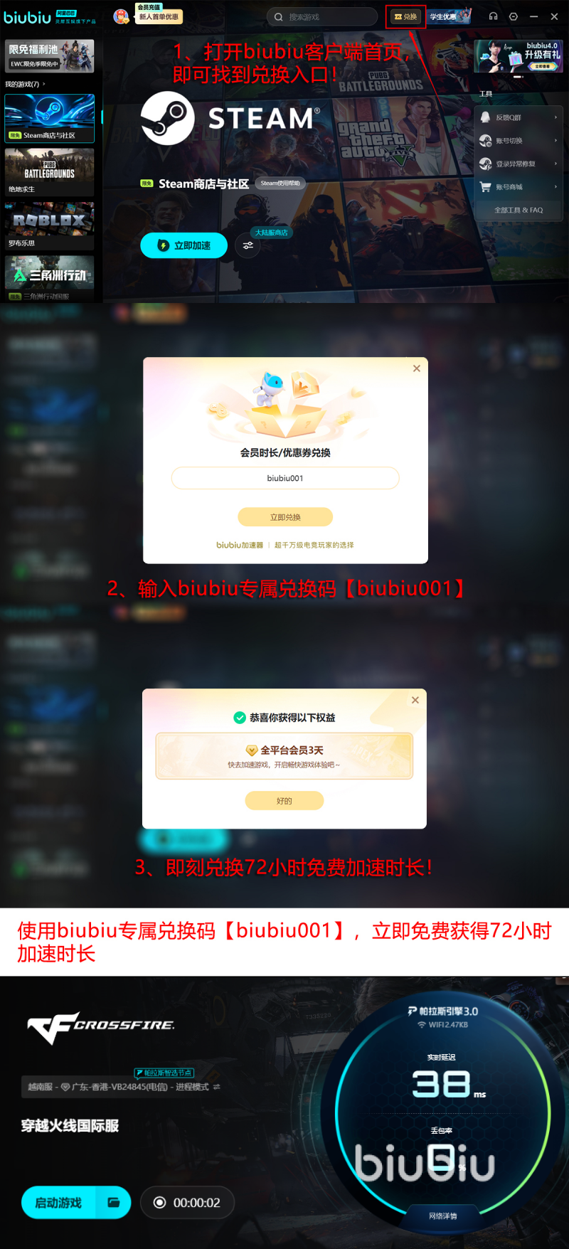 如果你对具体的加速效果存在顾虑的话,那么可以点击上方链接下载领取免费试用活动,新用户注册之后就能获得24小时免费加速时长,其余所有新老玩家都能够使用兑换码【biubiu001】成功领取72小时免费加速福利,新用户将两种活动全部领取之后叠加至96小时。