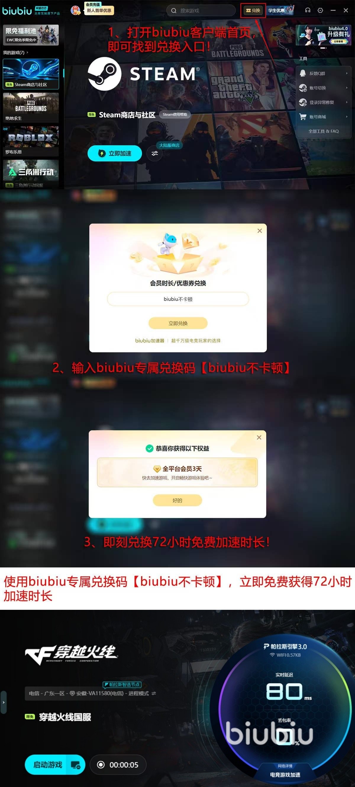 新人首次注册biubiu加速器,立马享受24小时免费加速时长,输入专属兑换码【biubiu不卡顿】,还能再额外领取72小时免费加速时长,合计96小时免费加速,畅玩cf毫无压力,轻松解决你登录不进去,掉线卡顿的烦恼。它是阿里巴巴灵犀互娱旗下产品,依托大厂,安全又有保障!