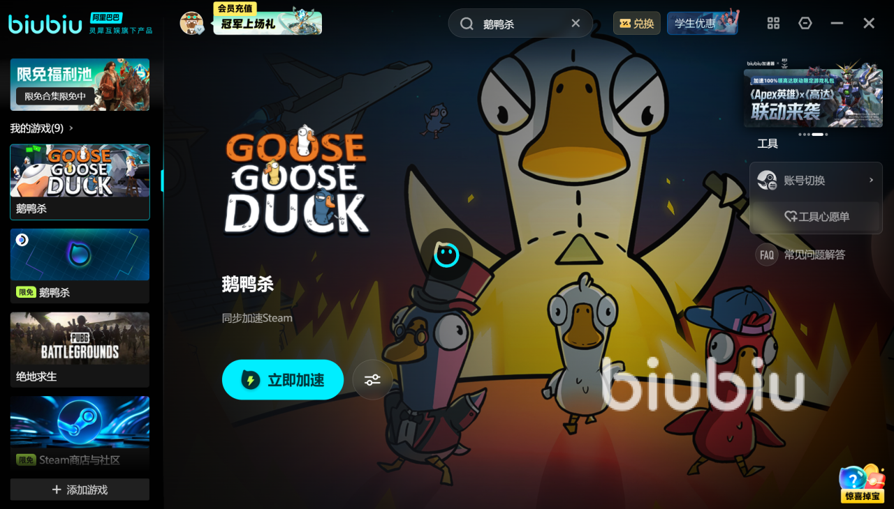 2026年03月26日 15:06 来源:冰甲风化石翼龙最近逛论坛看到很多小伙伴们都在问《鹅鸭杀》怎么又登不上了。作为一款社交推理神作,进不去游戏确实太扫兴。其实大家遇到的鹅鸭杀网络问题无法登录主要是因为游戏服务器在海外,国内玩家直连时延迟太高。针对这种情况,小编实测下来,biubiu加速器是综合实力最强的选择。不仅能一键解决登录问题,还能让游戏全程流畅不卡顿。