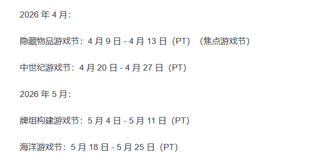 在4月,于4月9日到13日期间,开展隐藏物品游戏节,然后在20日到27日期间,开放中世纪游戏节。到了5月份,5月4日到11日期间,会举办牌组构建游戏节,然后18日到25日期间,举行海洋游戏节。这些都是主题类的促销活动,看到喜欢的可以选择买入。