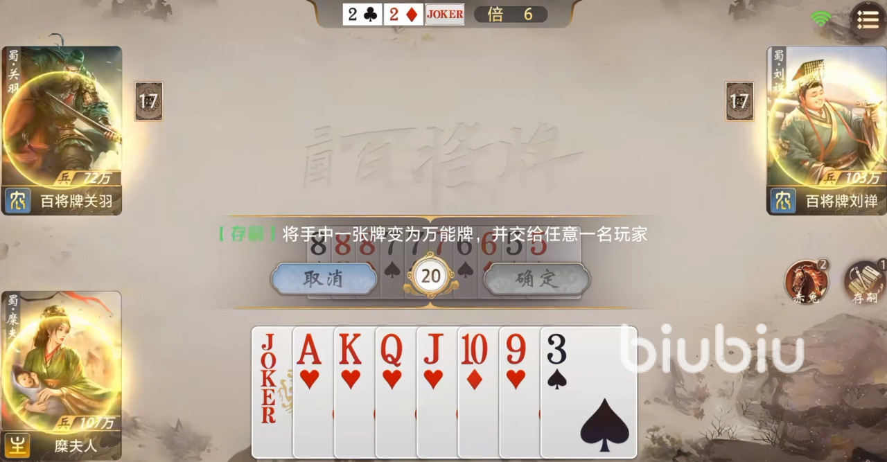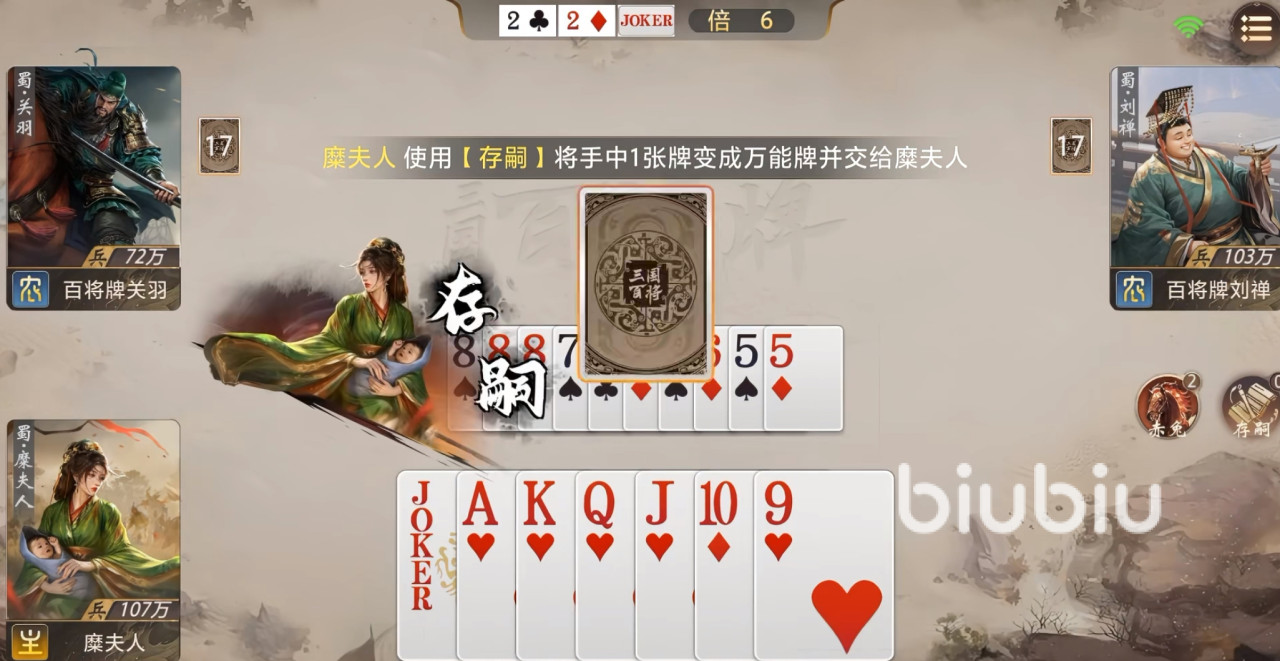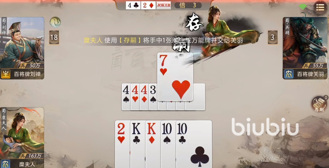 开局阶段,若持有连对、三带一或顺子等高效过牌组合,建议积极争夺地主身份。此类牌型能显著加快手牌消耗速度,更快满足【存嗣】的触发门槛。获得万能牌后,应优先保留炸弹、大对子等高权重牌型,确保后续仍有足够组件支撑强力收尾组合。若身处农民阵营,且队友为关羽、赵云等同样具备万能牌获取能力的武将,则可将万能牌定向传递,大幅提升组成五星炸弹、超长顺子等终结性牌型的概率,从而掌控胜负主动权。
