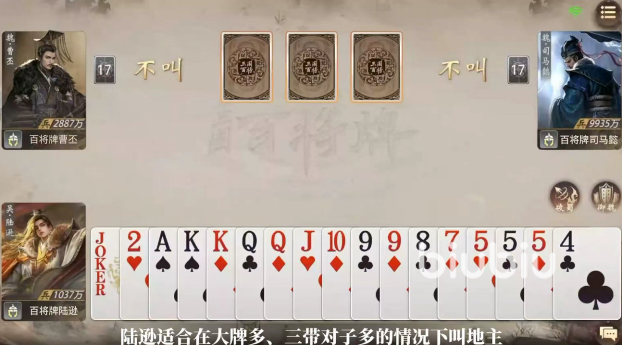 当陆逊担任地主时,建议在手握多张大点数单牌或具备三带二结构基础时果断抢庄。实战中可采用“小换大、对换炸”的策略模型:以低点数对子压制对手单牌,再利用“破蜀”补牌快速组建三带二组合,持续压缩对手响应空间。值得注意的是,地主身份额外激活一项随机坐骑技能,需结合陆逊技能特性进行优选。