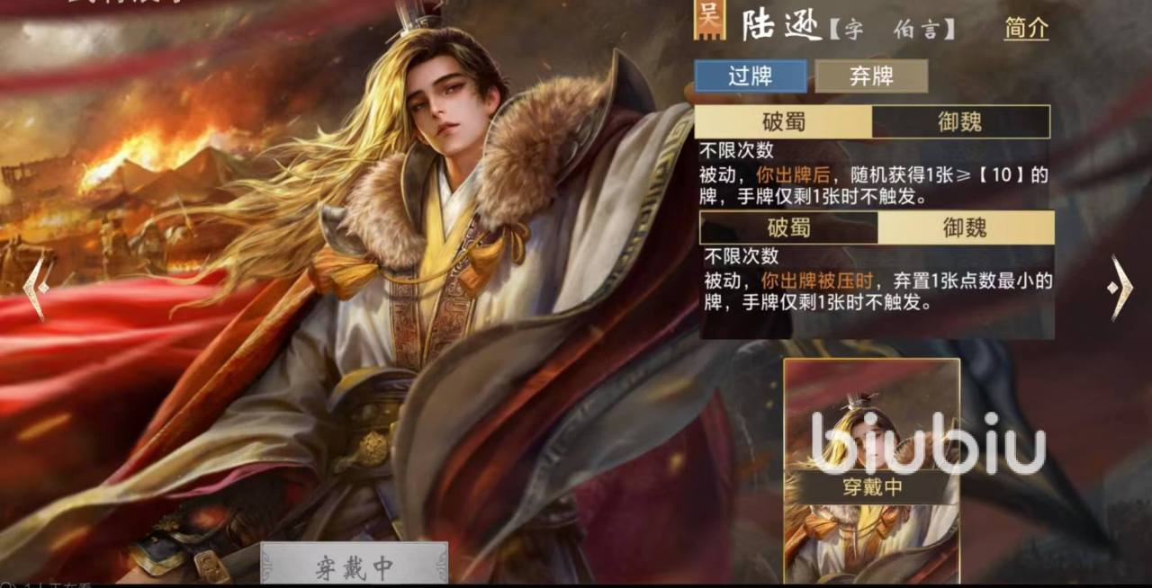陆逊的核心能力集中于“控牌”与“续牌”两大维度:其一,“破蜀”技能可在每次出牌后,随机抽取一张点数不低于10的牌(即J、Q、K、A),有效补充高价值手牌;其二,“御魏”技能在出牌被压制时,强制弃置一张最小点数牌,实现低损换牌与节奏反制。该组合机制赋予陆逊极强的牌权争夺能力,尤其适配地主身份——不仅手牌容错率高,且能通过持续摸牌与精准弃牌维持主动权。