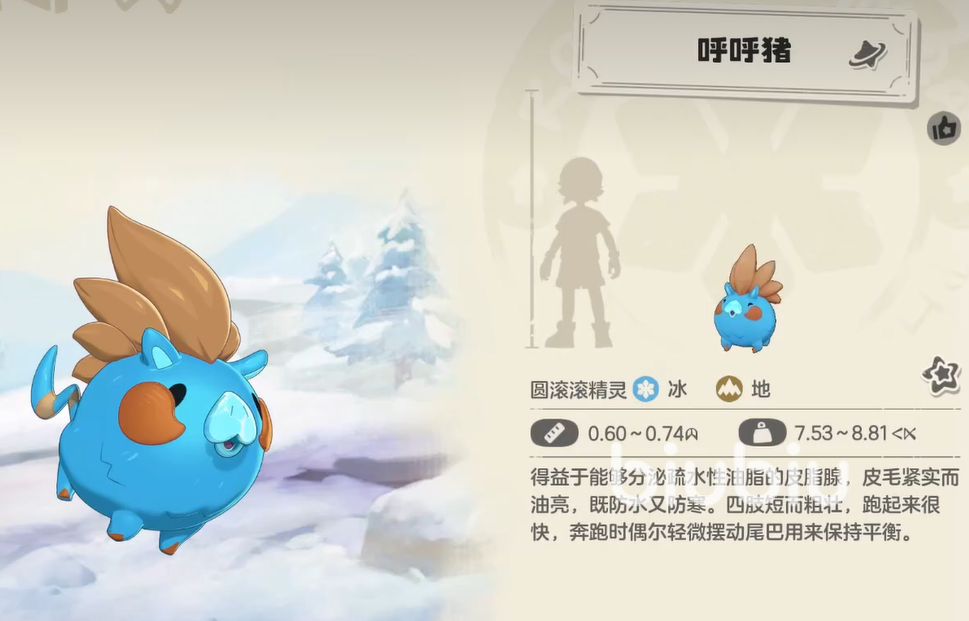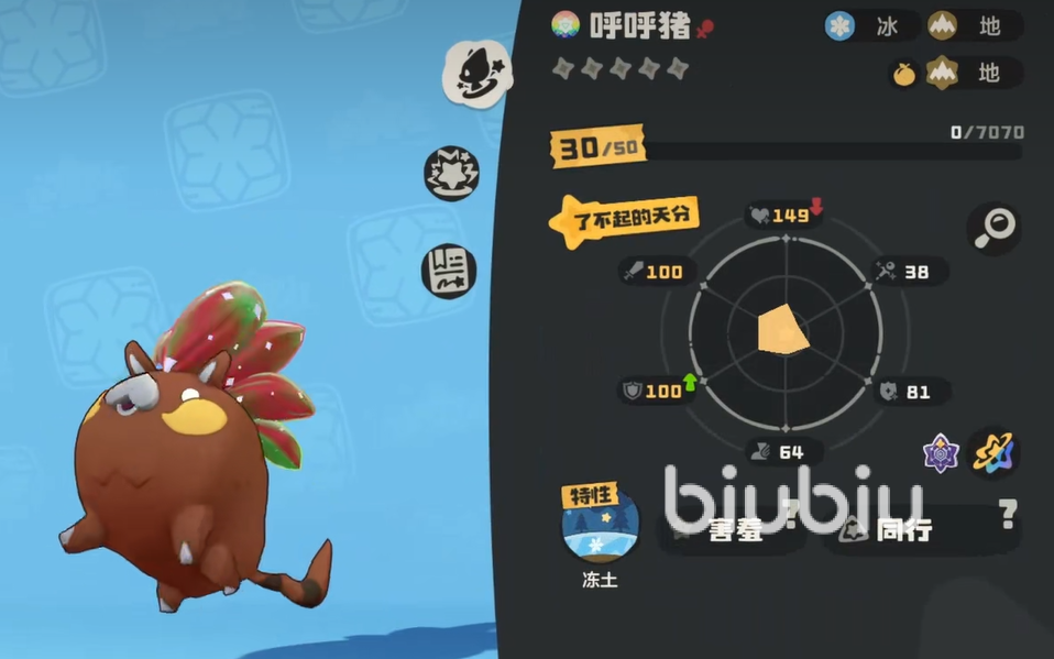 在属性分布上,呼呼猪的生命值与魔法防御两项指标尤为突出,赋予其良好的生存韧性;物理攻击力虽属中等偏上,但并非核心输出依赖项。真正体现其战术价值的是专属特性:当携带冰属性技能时,地属性技能的伤害将获得显著加成。该机制不依赖单一属性堆叠,而是通过属性协同实现战力跃升。