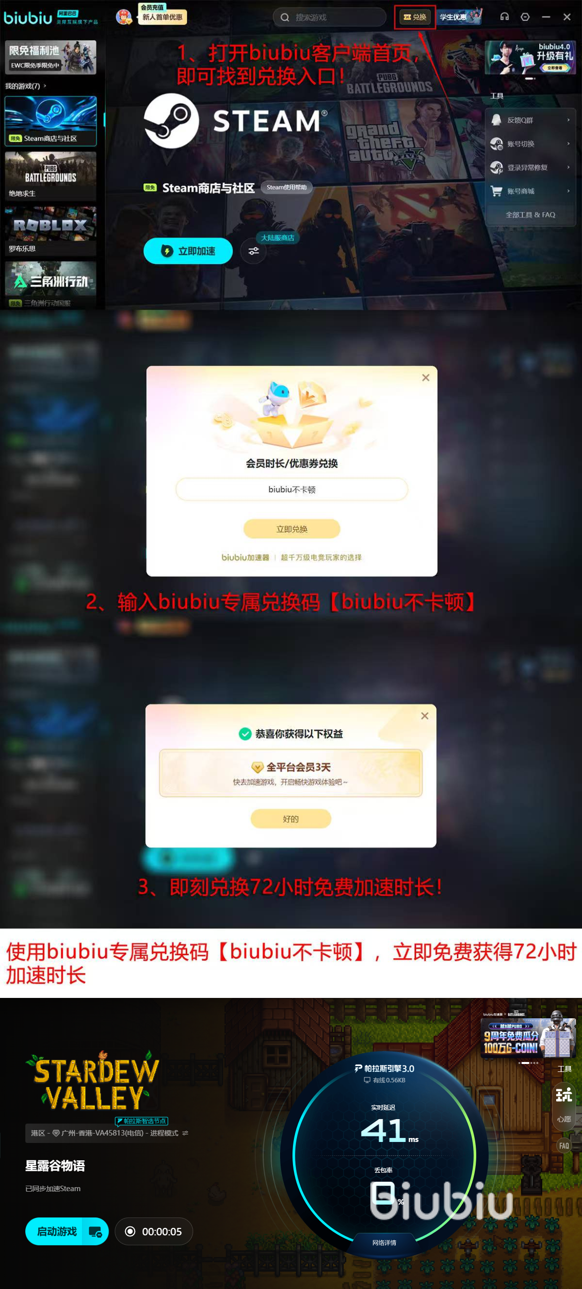 biubiu的福利非常丰富,新老用户都能轻松薅到羊毛。新用户只需注册登录,无需任何复杂操作就能直接领取24小时免费加速,足够畅玩一整天的星露谷物语。此外,所有用户只要在加速器内输入兑换码【biubiu不卡顿】,还可额外获得72小时免费加速。既能解决星露谷物语闪退的问题,又能省下一笔开销,整体性价比相当不错。