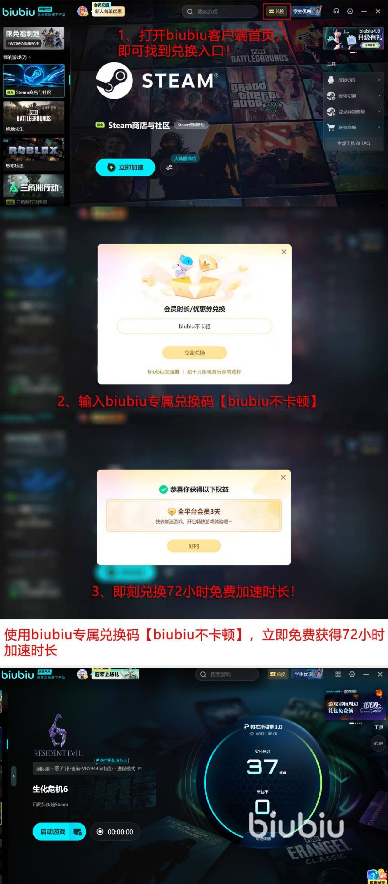 biubiu对新用户也挺友好的,注册登录完成之后直接就有24小时的免费加速时长可以用,不用花钱就能体验完整功能。用完之后还可以输入兑换码【biubiu不卡顿】,再领72小时的免费时长,两段加起来一共96小时,足够把生化危机6好好打一遍了。