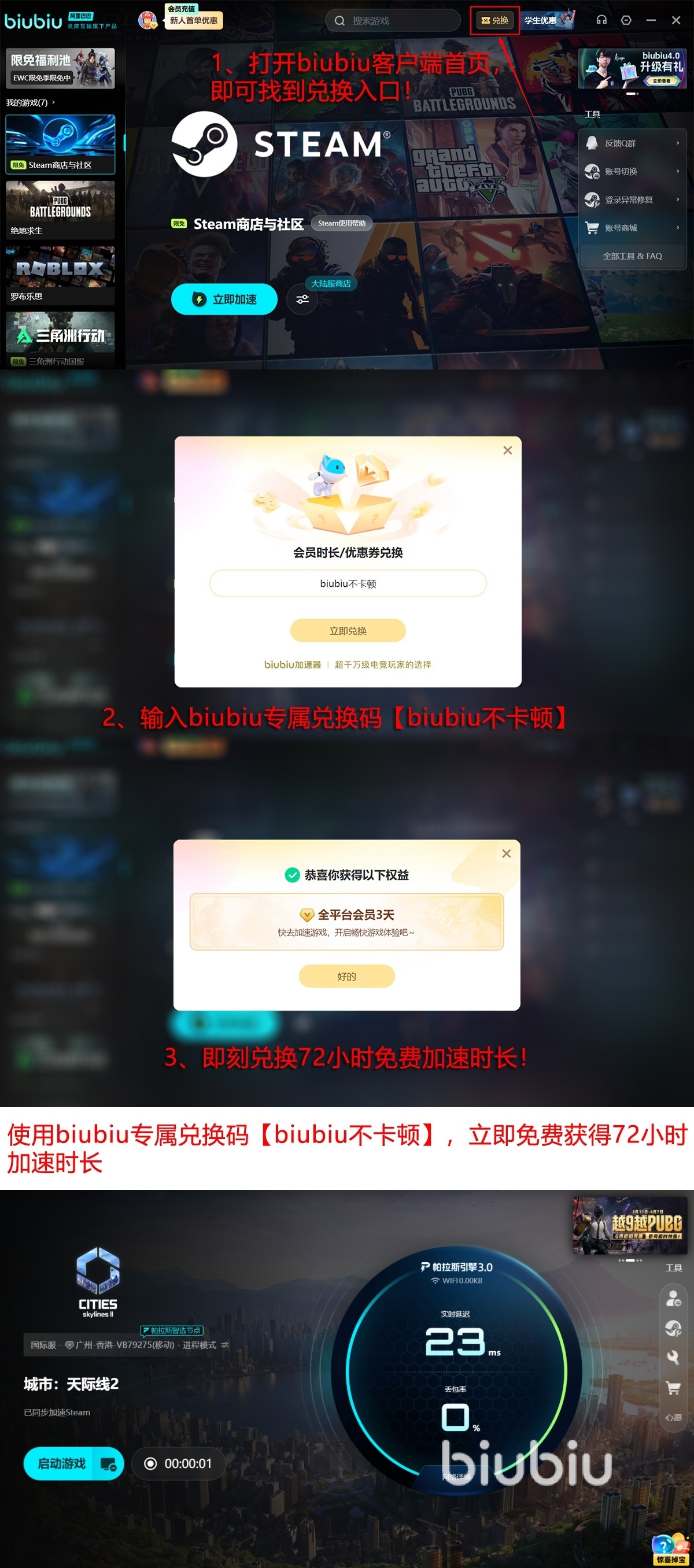 现在来注册,新人立刻享受24小时的全功能免费体验。而且更有好消息是,新老用户在兑换栏输入口令码【biubiu不卡顿】,还能够拿三天免费加速时间。这些时间足够你从零开始规划百万级人口现代都市,亲自检验闪退是否得到好的改善。