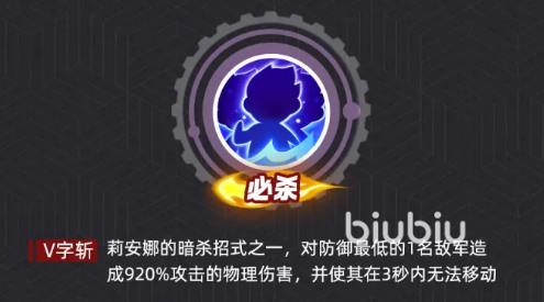 其标志性技能【V字斩】是整套输出体系的核心支点:基础伤害倍率为750%,命中后附加3秒不可行动硬直效果。该数值在当前版本所有单体技能中处于第一梯队,一次完整释放往往可直接清减敌方核心战力;而3秒的强制控场时间,则为团队创造了理想的集火窗口——队友可无缝衔接连招、补刀或施加持续伤害,显著提升整体输出效率与战斗容错率。无论是在天梯排名赛中压制对手主力,还是在高难度副本中定点清除BOSS机制单位,该技能均具备不可替代的战略价值。
