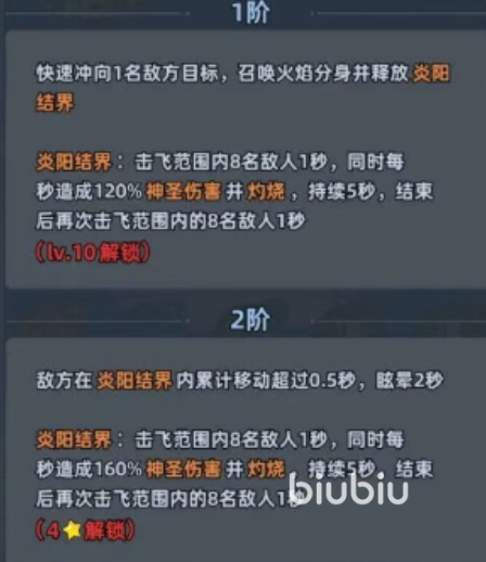 二技能采用三阶成长体系,基础形态下突进至敌方区域并召唤火焰分身,展开炎阳结界。结界生效期间对范围内最多8名敌人施加1秒击飞,并每秒造成120%攻击力的神圣元素伤害;灼烧持续5秒结束后,有概率再次触发覆盖8目标的击飞效果,该追加击飞仅可触发一次。升至二阶后,敌方单位在结界内累计移动时间达0.5秒即触发2秒眩晕;晋升三阶后,眩晕时长提升至3秒。相较一技能,二技能在群体控制覆盖率与持续压制力方面更具战略价值。