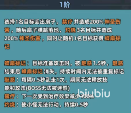 一技能以扇为器,实现“单点穿透+群体溅射”双重结构:锁定单体目标造成200%攻击力的物理伤害,扇子命中后落地瞬间触发三目标范围灼烧,同样附带200%攻击力的神圣元素伤害。该技能同步施加“蝶扇”印记,叠满层数可使目标进入1.5秒魅惑状态。需注意该效果为一次性触发机制——印记随魅惑结束自动清除,无法通过重复施放叠加层数。因此实战中建议搭配具备稳定控场或高频标记能力的队友,确保控制链持续性。