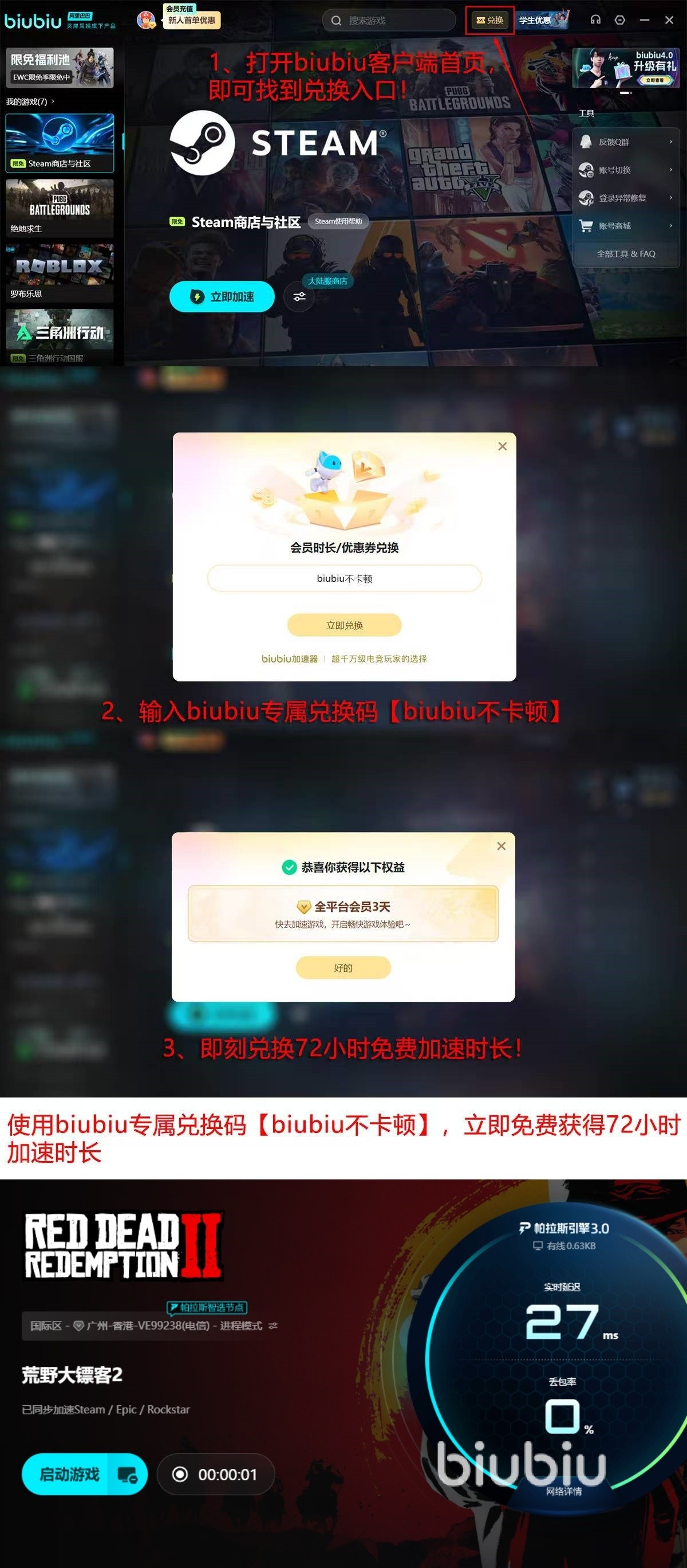 biubiu加速器安装便捷,即装即用。新用户注册后可立即获得24小时全功能免费试用权限;输入专属口令“biubiu不卡顿”,还可额外领取3天加速时长,涵盖《荒野大镖客:救赎2》在内的多款主流PC及主机模拟类游戏均支持免门槛加速体验。
