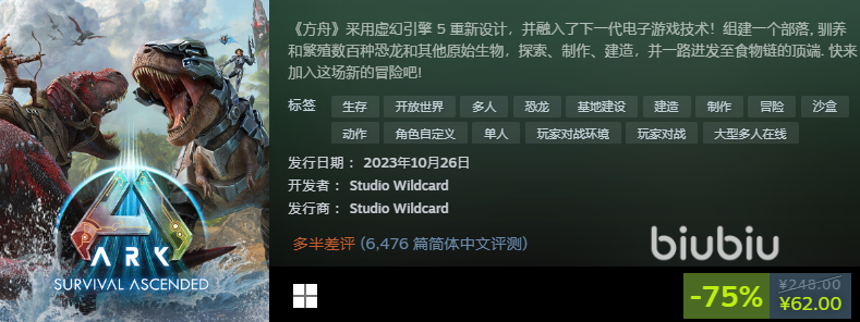 在Steam搜索栏输入“方舟”,即可直达《方舟:生存飞升》商品页。目前该游戏正处于促销阶段,折后价为62元,相当于原价的2.5折。该价格涵盖完整本体内容,支持玩家搭建基地、采集资源、驯养史前生物,并在开放世界中与恐龙共存。