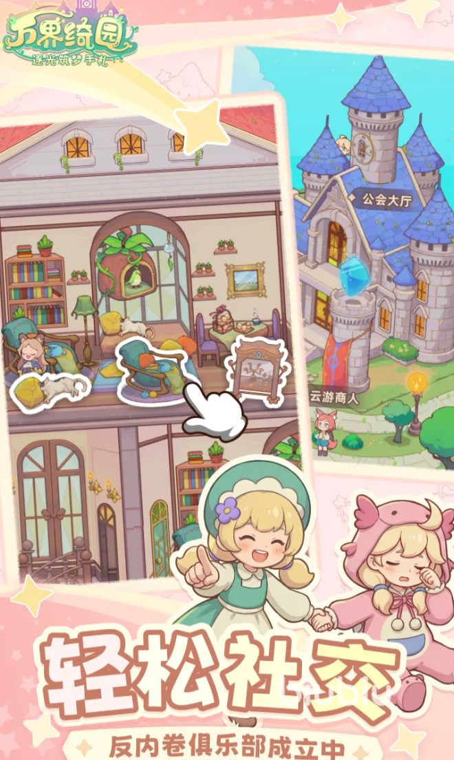 视觉呈现上,游戏摒弃高对比、强刺激的配色方案,采用柔和统一的莫兰迪色系,辅以细腻的手绘质感与留白构图,营造出兼具日式静谧感与童话氛围的独特美学风格。作为庄园的缔造者,玩家不仅承担经营职责,更拥有完整的地形编辑权限:可开凿湖泊、堆塑山丘、铺设路径,并自由融合东方枯山水庭院、北欧森林小屋、蒸汽朋克塔楼等多元文化建筑元素。从初始的裂隙荒原,逐步演化为生机盎然的跨维度文明驿站——这种“亲手塑造世界”的沉浸式创造体验,为现代生活节奏下的玩家提供了切实可感的情绪出口与心理缓冲空间。