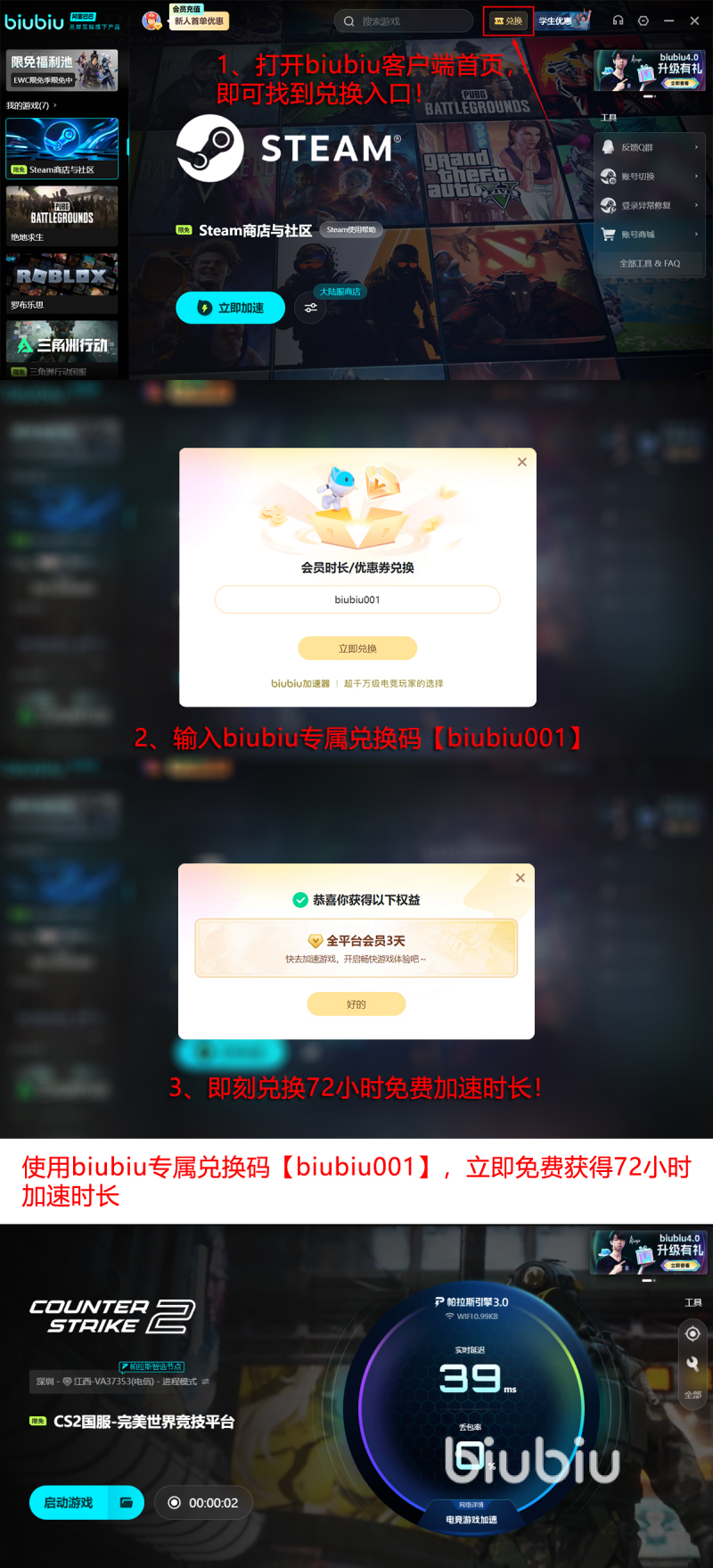 当前平台开放限时福利:所有用户均可凭通用兑换码【biubiu001】领取3天免费加速时长;新注册用户首次申领还可额外获赠24小时专属时长。两项权益叠加使用,总计可享96小时无费用加速服务,相当于完整覆盖四整天的高强度训练或排位周期,全程无需支付任何费用。