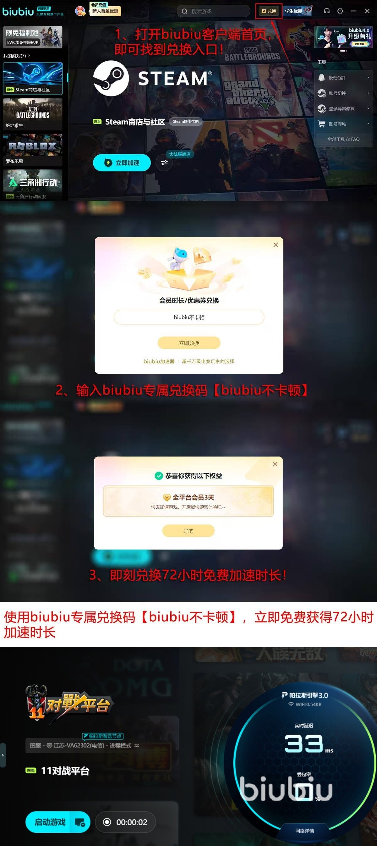 面向新用户,biubiu加速器设置无门槛体验机制:完成首次注册后,系统自动发放24小时全平台通用加速时长,无需绑定支付方式或填写邀请信息,即可立即启用11对战平台专属加速通道。此外,输入官方指定兑换码【biubiu不卡顿】,还可额外激活72小时连续加速权益,累计达96小时免费使用周期。该福利覆盖所有主流Windows系统版本(含Win7 SP1及以上),且不限制设备更换频次,确保新手玩家在零投入前提下,完整验证工具稳定性与实际效果。