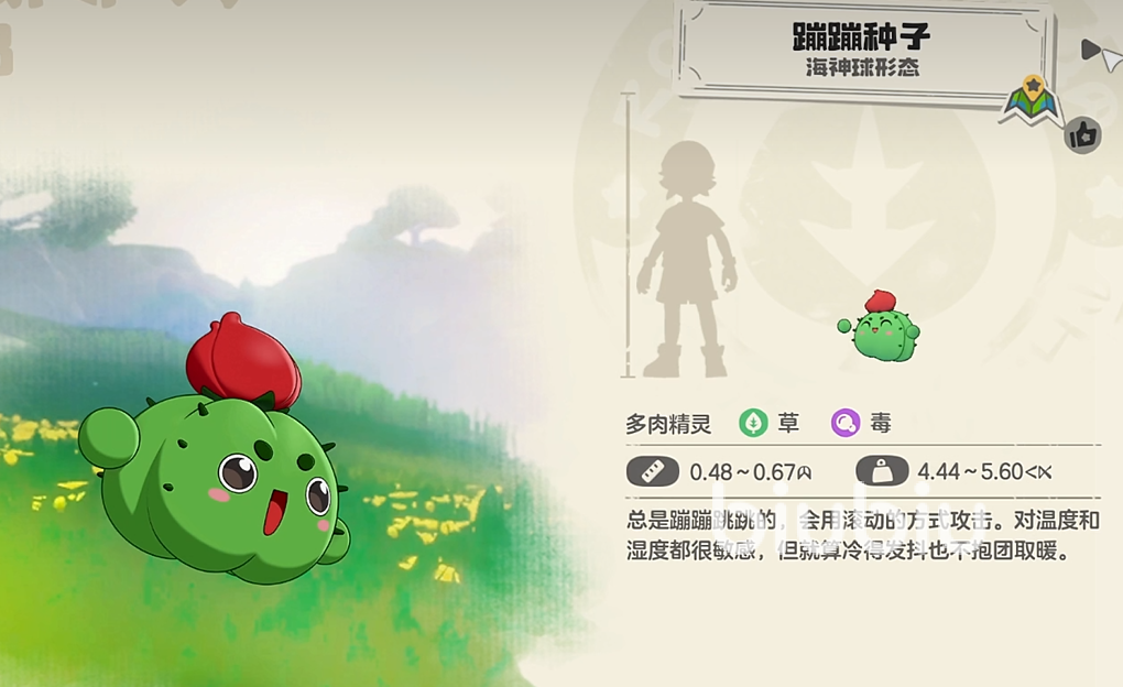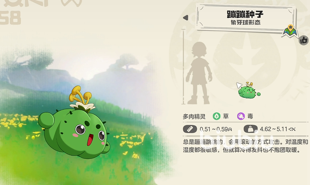 蹦蹦种子拥有草+毒双属性组合,这一配置赋予其鲜明的战术定位。草系提供稳定的续航基础与抗性优势,毒系则强化了持续压制能力,使其在持久消耗战中表现突出。获取方式便捷,位于游戏内动物园场景,无需前置战斗即可直接使用收服技能捕获,对新人玩家极为友好,无等级或装备门槛限制。