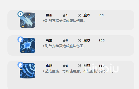 水蓝蓝的核心机制依托于“浸润”特性:每次使用水系技能后,自身所有技能的PP消耗减少1点。该效果支持高频连招循环,显著延长持续作战能力。属性克制关系明确,对火系、地系及机械系目标可触发本系克制加成;需注意规避电系与草系对手,以维持输出稳定性。种族值分配侧重输出与双防平衡——魔攻84,物防58,魔防74,生命与速度属中等水平,在培养过程中建议优先提升魔攻、速度与HP三项关键维度。