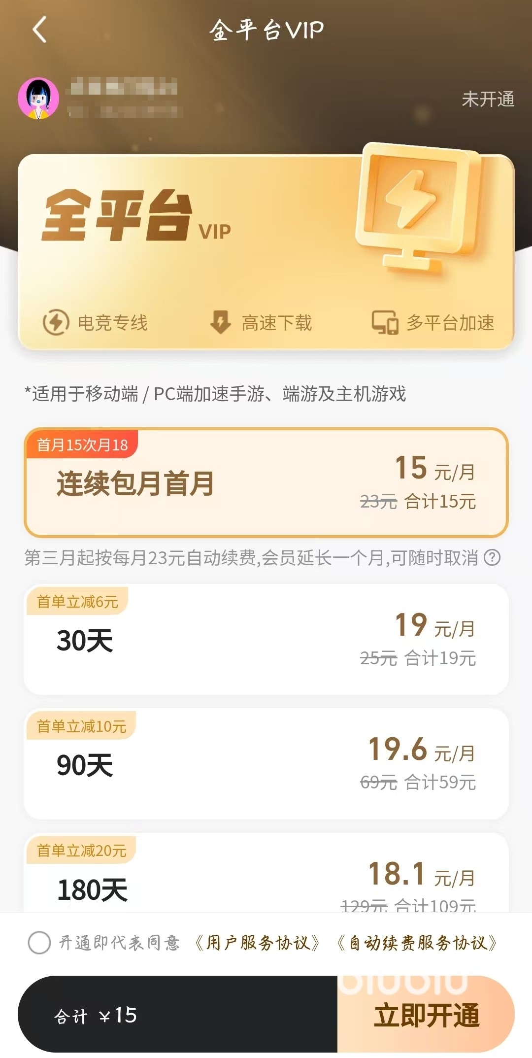 长期用户可选择订阅会员计划,首充享限时优惠;在校大学生完成学生认证后,可解锁专属学生价,年度费用降低约37%。若同时活跃于移动端与PC端游戏生态,推荐选购全平台通用会员,单账号授权覆盖iOS、Android、Windows三端,加速策略智能同步,无需重复订阅。