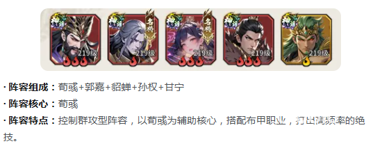 【群攻谋伤队】以荀彧为战术中枢,依托其谋略增益与技能循环加速特性,配合郭嘉提供稳定控制链,貂蝉维持战场节奏与生存韧性,孙权与甘宁构成双核AOE输出结构。整队具备高频绝技释放、持续群伤压制与多段控场能力,兼顾副本攻坚与小规模遭遇战需求。