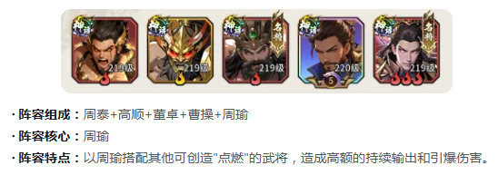 【火神降世队】周瑜为核心驱动者,协同周泰、董卓、高顺组成灼烧体系。周泰与董卓负责抗压与反伤铺垫,高顺强化灼烧叠加效率,周瑜则作为引爆终端,通过多层点燃效果触发高额范围爆炸伤害。该阵容强调持续环境伤害与后期爆发节奏,适合持久战与高难度关卡攻坚。