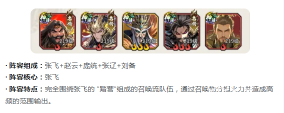 【煞影重重队】围绕张飞召唤机制深度构筑,赵云与张辽担任突进切入位,庞统提供技能协同加成,刘备承担治疗与续航职能。张飞召唤物兼具嘲讽分担与高频范围输出双重作用,可有效限制敌方核心单位行动,并对脆皮阵容形成压制性打击,是应对快攻与爆发流派的优选配置。
