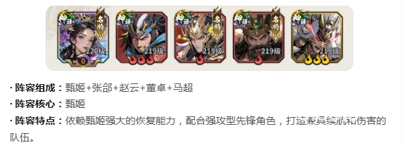 【鼓舞强攻队】甄姬为全队续航支点,凭借其稳定治疗与状态维持能力保障队伍持续作战强度;赵云、马超组成高速强攻前排,董卓担任主坦吸收关键伤害。该阵容在消耗类战斗中表现尤为突出,可通过循环恢复与稳定输出维持全程高战力状态,越战越强特征明显。