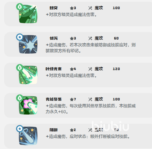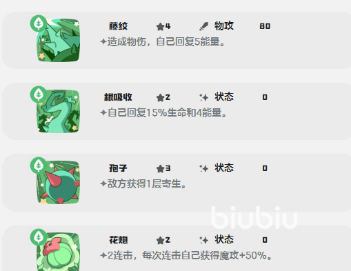 输出构建方面,格兰球以魔攻为核心路线。核心技能“光能聚集”支持多段威力叠加,每使用一次即可提升后续释放的伤害系数,形成滚雪球式爆发增长。物攻端配备“仙人掌刺击”,具备高基础威力与稳定命中率,配合“顶端优势”效果,可快速完成残局收割。生存维度上,“吸取”技能提供100%吸血效果,实现持续作战与能量积累同步进行;“休息回复”可在单次行动中恢复30%最大生命值,叠加吸血机制后大幅延长站场时间。控制链则由“寄生种子”“溶解液”“毒孢子”构成,可叠加中毒层数,并通过“腐化”技能依据中毒层数削减敌方攻击能力,形成软性压制闭环。