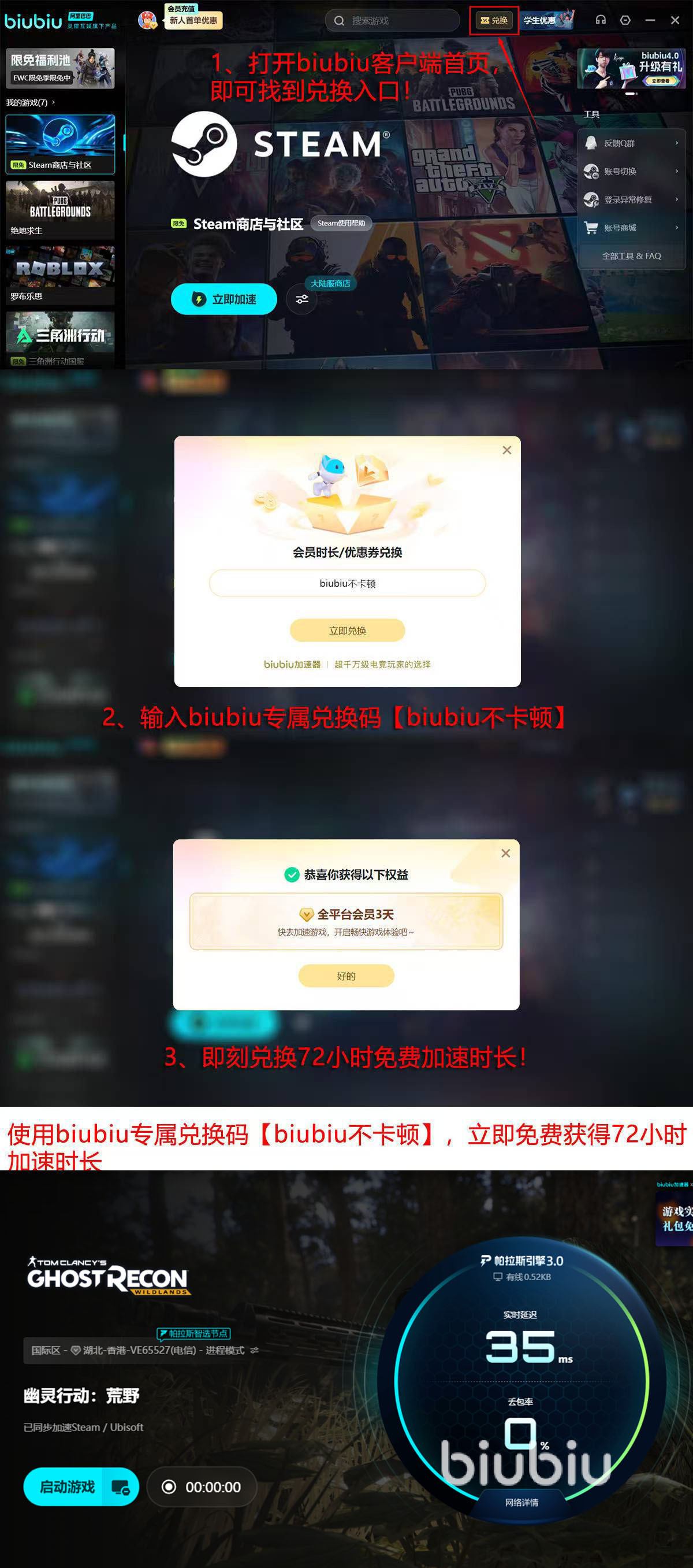 若您正面临《幽灵行动:荒野》登录失败问题,建议优先尝试biubiu加速器实测效果。新用户注册后即可获得24小时免费使用权;登录客户端后进入“兑换”页面,输入激活码【biubiu不卡顿】,可额外领取72小时服务时长,总计享96小时无限制加速体验。