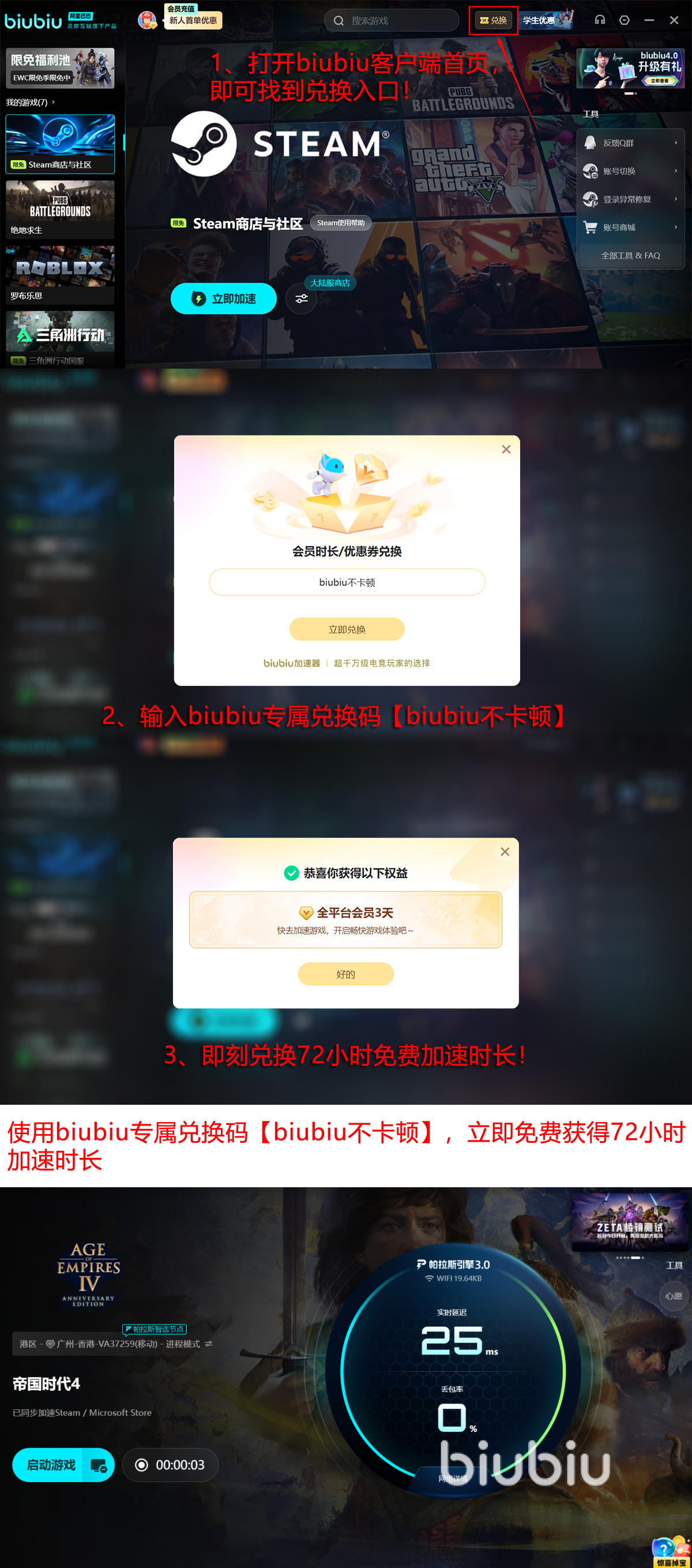 别再等待,心动不如行动。新人现在点击文中的按钮,首次注册使用biubiu即可激活24小时的免费使用时间。在首页兑换处,键入【biubiu不卡顿】福利码,不论你是新人还是老用户,均可以收到三天的免费加速时间。