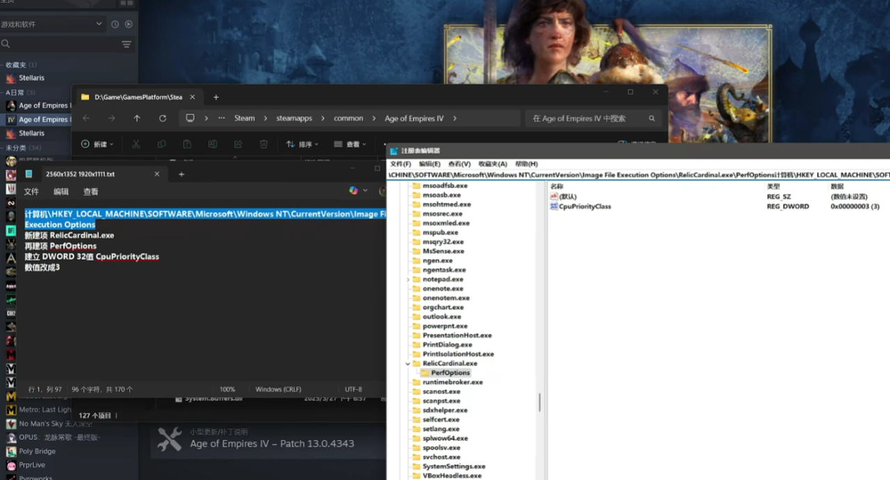 遇到闪退的话,可以先查看崩溃的文件夹,查看运行日志里面会有报错的提示。如果提示里面说模组或者地图版本过旧,则需要自行的升级游戏相关的补丁。在此之后进入注册表编辑器,如图所示地址,打开“image file execution option”新建项目RelicCardin、然后建立dword32值CpuPriorityClass,数值改为三,这样就可以改程序的优先级解决界面卡退。