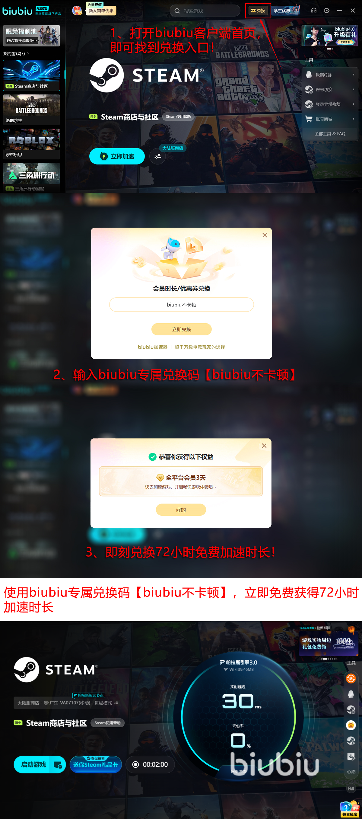 新人现在来使用,注册登录之后就能获得24小时的免费使用时间。而且新老玩家们,还有3天的免费时长可以领取,只需输入【biubiu不卡顿】兑换码即可。