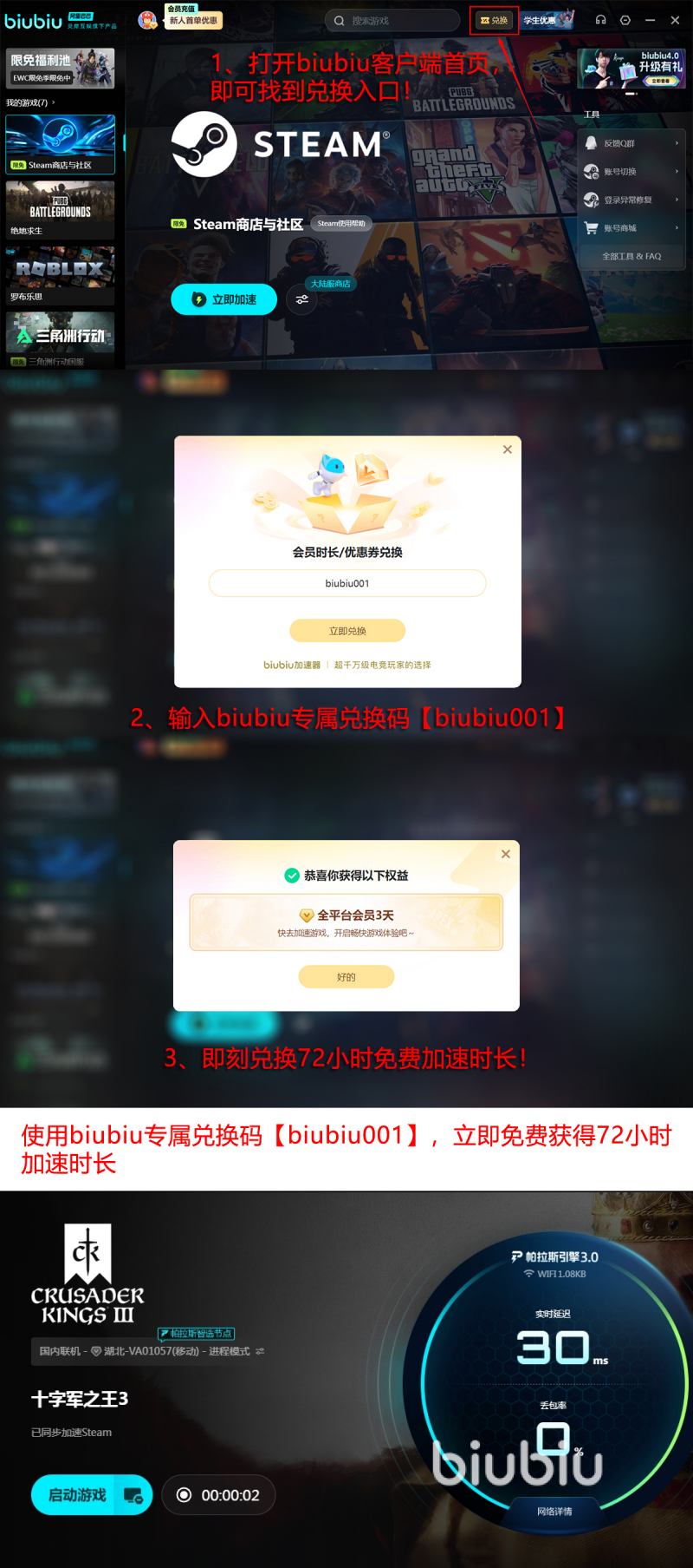 新用户如果是第1次注册,那在登录之后就可以享受24小时的免费时长。如果觉得这个加速时长还不足够使用,那么使用兑换码【biubiu001】可获得3天免费加速时长,这一个口令,所有人都可以申请。新用户如果叠加两种方法,就可以免费长达96小时,可以轻松的享受加速的体验,沉浸于游戏中。