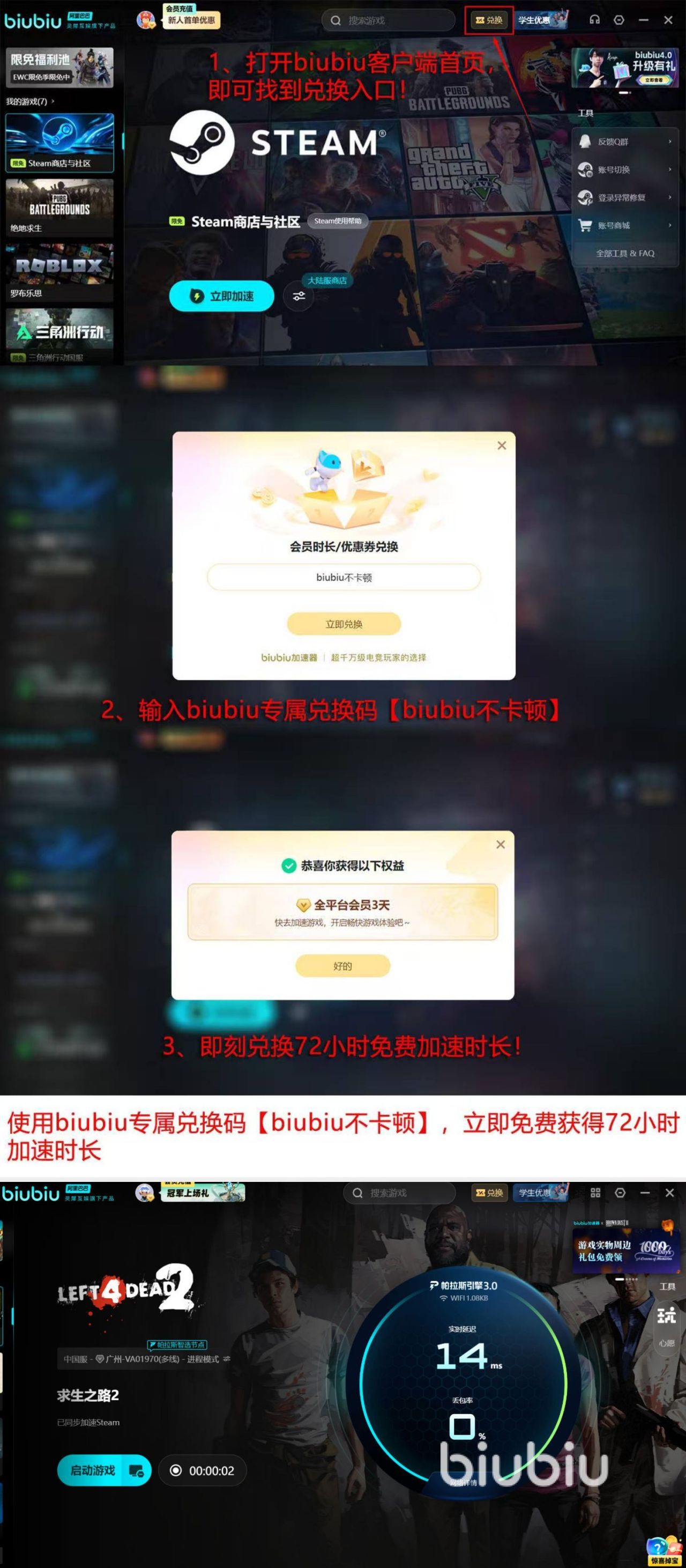 新用户注册后即可获得24小时无门槛免费加速权限,无需预充值。使用完毕后,输入专属兑换码【biubiu不卡顿】,可额外激活72小时使用权,累计达96小时。该周期足以覆盖完整通关流程及多人合作模式高频使用需求,便于用户充分评估实际加速效果后再决定是否续订。