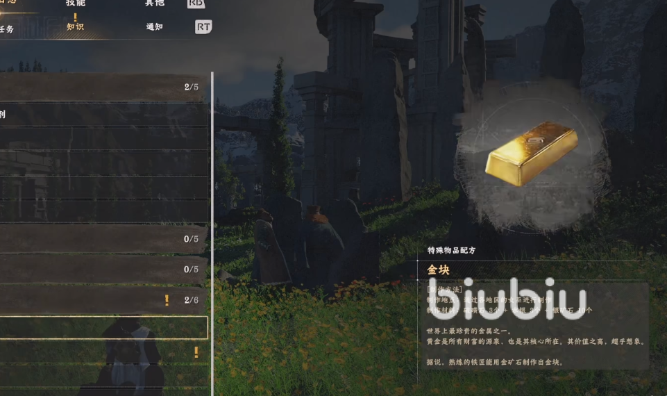 首先介绍是大家最关心的金块配方了,这个配方所需的材料是三个硫磺石三个水银加上是个银矿石,其实这里也很疑惑为什么银矿石能炼出金块来,这个也正是炼金术的神秘和魅力之处了。这个方子获取的方式需要我们去赫尔南德南部的洞察尖塔完成解谜任务来获得,之后我们可以通过向斯科拉斯敦研究院的学者送礼来高效率的获得材料,这里要注意不同颜色衣服的学者对应的是不同的材料。
